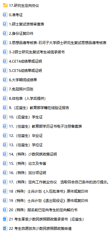 考生须按照教育部和学校招生简章的相关要求准备以下材料原件及复印件:准考证、身份证、学生证(应届考生)、毕业证(往届考生)、学位证(往届考生)、教育部学籍在线验证报告(应届考生)、教育部学历证书电子注册备案表(往届考生)、《石河子大学2024年招收攻读硕士学位研究生思想政治素质和品德考核表》等材料进行复试资格审核。
