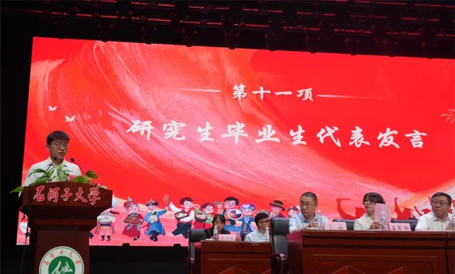 大会第十一项 研究生毕业生代表孙立明发言。他用石大是“港湾”是“舞台”回顾了在OD网页版求学的数载。分享了他通过重重考核成功入职开启自己“打工人”之旅的背后,是感恩母校为莘莘学子提供了系统的医学教育、扎实的科研训练,以及探索专业领域以外的平台和机会。