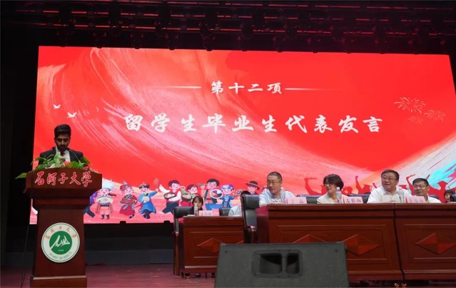 大会第十项 本科毕业生代表杜威发言。他用“感动、感谢、感恩”作为主题词,讲述了他与石大医学院邂逅的故事,他号召各位毕业生朋友们在未来不断学习积极进取,为祖国的医学事业贡献力量,同时祝福老师们身体健康、工作顺利,祝愿母校人才辈出、永续华章。