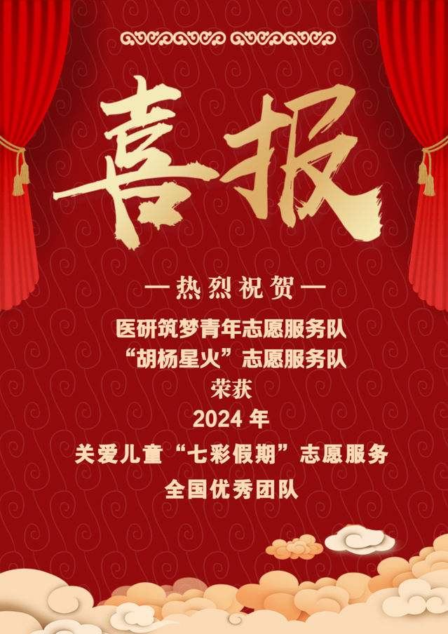 近日,团中央和中国青年志愿者协会联合公布了2024年“七彩假期”志愿服务优秀团队遴选结果,医学院医研筑梦青年志愿服务队、“胡杨星火”志愿服务队获评“优秀团队”称号(全国仅200支团队获评)。