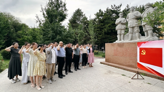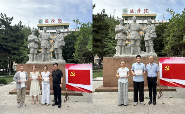 主题党日第二阶段,忆初心砺使命,强化身份认同。在医学院南门王震将军雕塑像前,三个支部全体党员面向党旗举起右拳,重温入党誓词,铿锵誓言响彻现场。在党旗下,王官利、韩晓玲作为党员代表,深情讲述““党员心声””,回顾入党初心与成长历程。张青、路国栋为过政治生日的党员赠送生日卡,强化党员身份意识。全体党员在王震将军雕塑像前合影留念,定格红色初心。