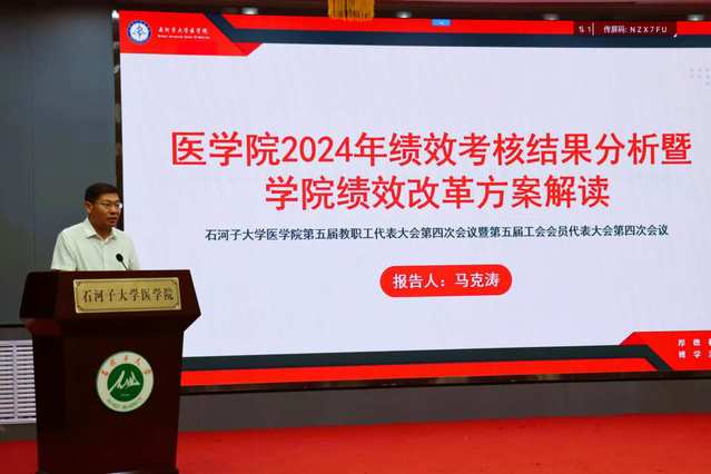 7月4日下午16时,大会在庄严的国歌声中开幕。第一次全体会议上,党委副书记、院长马克涛同志向大会作题为“赋能强基 抢抓机遇 聚力攻坚 奋进新程 谱写医学院高质量发展新篇章”的工作报告,并深入分析了医学院在学校2024年绩效考核中的优劣势和面临的机遇挑战,详细解读了《医学院奖励性绩效工资发放办法(审议稿》。大会书面报告了学院财务工作报告和工会工作报告。