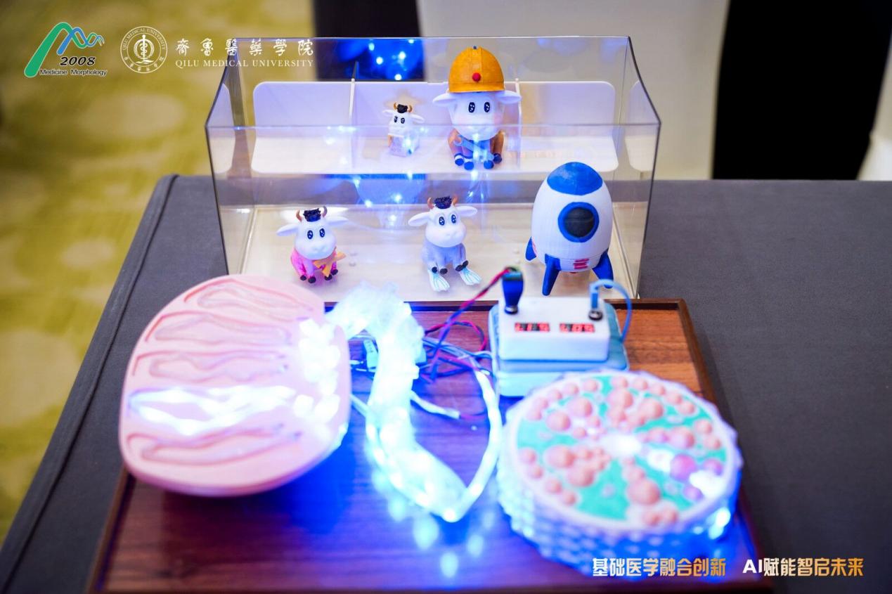 《“精”雕细琢,生命之源》由医学院2022级临床医学专业袁钰琦、朱运豪、徐健宇、寇丁月,与机械电气工程学院2023级机械设计制造及自动化专业丁琦、2023级农业机械化及其自动化专业冯富慧跨界合作完成,作品创新性融合医学知识与工科技术:不仅呈现睾丸附睾、生精小管和不同阶段精子细胞实体模型,更以“小牛”卡通形象拟人化演绎细胞功能,用光点动态示踪设备呈现精子细胞的产生及排出路径,实现复杂知识的通俗化呈现。