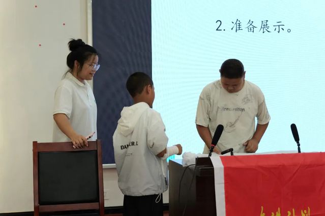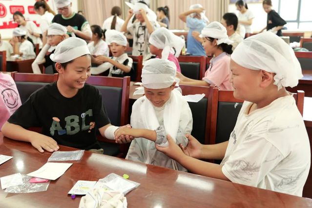 进行一系列讲解之后,现场还进行了小朋友们的实践操作展示环节。同学们两人一组,一人扮演包扎员,一人扮演手臂受伤的伤员,在小老师的指导下,复习刚才学习的包扎步骤,其他同学则认真观察,提出改进建议,现场互动积极。