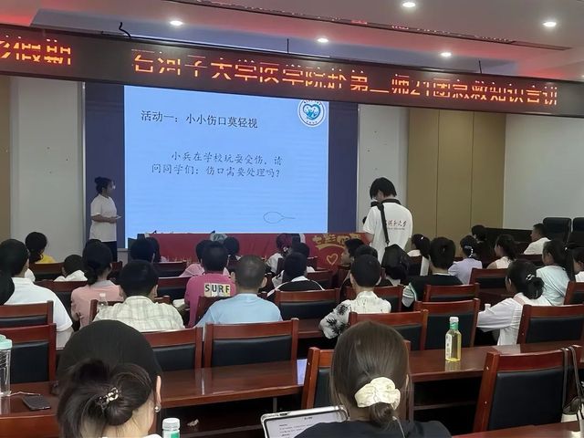 活动中,实践团成员李嘉敏首先通过提问互动,引出“小伤口藏大危险”的话题。她结合糖尿病患者足部小伤口可能发展为糖尿病足、鞋子磨脚引发败血症等案例,向同学们强调,伤口的危害不能仅看大小,还与部位、深度、污染程度等相关,如被带铁锈的钉子划伤深伤口可能导致破伤风,接触泥土或处于血液循环丰富部位可能引发败血症等,让同学们认识到重视伤口处理的重要性。