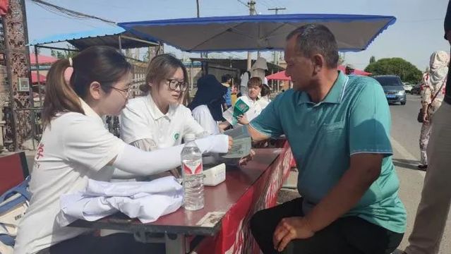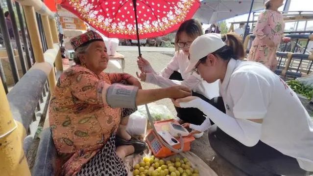 活动结束之际,同学们手持血压测量仪走进巴扎,给那些不便前来的摊主测量血压。“听到有人说你们那边免费量血压,我还挺想去的,可惜我这有摊子要看,还以为要错过了,没想到你们过来给我们量,真贴心。”卖杏子的摊主道。