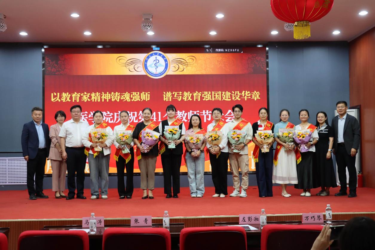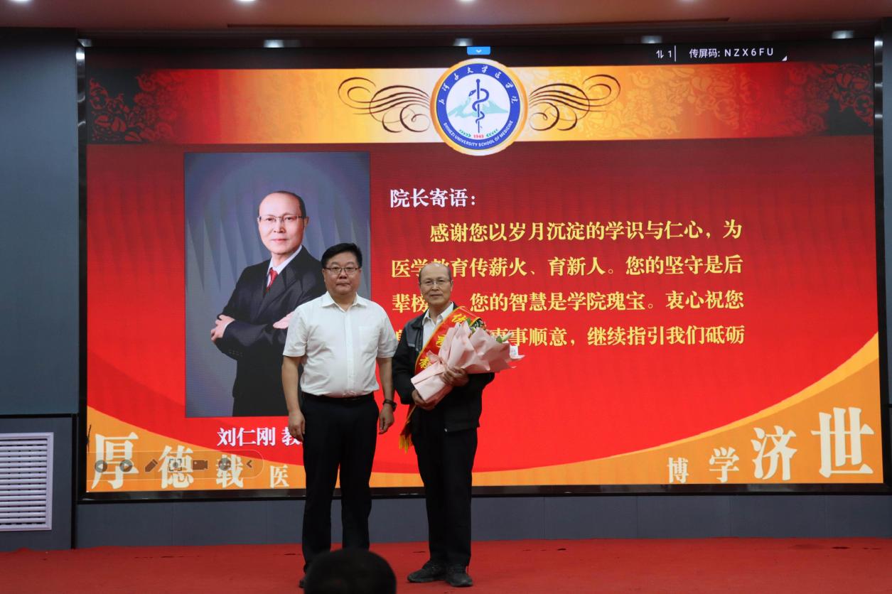 第三环节以“表彰先进,致敬芳华”为主题,左彭湘副院长宣读了医学院2025年上半年在教育教学、科学研究、管理服务等方面取得优异成绩的获奖教师名单,学院领导为获奖者颁发了荣誉。随后,党委书记张青为银龄教师献上鲜花,感谢他们不远万里支援西部教育,将宝贵经验和智慧倾囊相授,为学院发展注入了强劲动力。