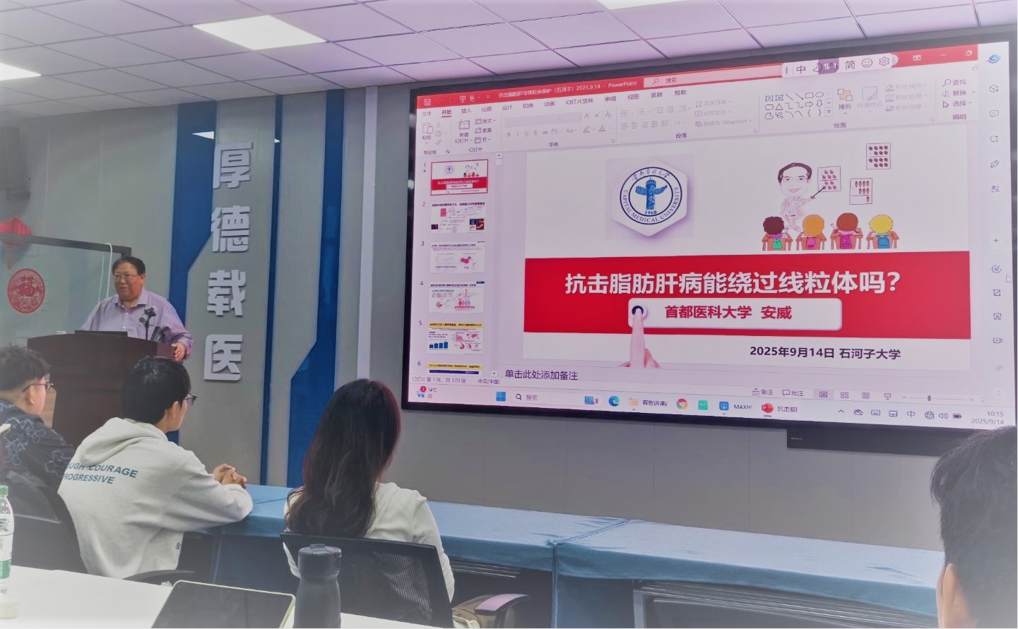 安威教授以《抗击脂肪肝病能绕过线粒体吗?》为题,深入剖析了线粒体功能障碍脂肪性肝病发生发展中的关键作用。将线粒体的内膜和外膜分别比喻为“长江”和”黄河”,脂肪的转运体CPT1和CPT2比喻为“羊皮筏”和“牛皮筏”生动形象的阐述了“脂肪在线粒体里究竟如何燃烧”;融合分子,剪刀分子如何维持线粒体的动态平衡;线粒体与内质网的互作等内容。讲座现场气氛热烈,让师生们对脂肪肝病与线粒体的关联有了更深刻的认识,为慢性肝病基础与临床转化研究提供了新思路。