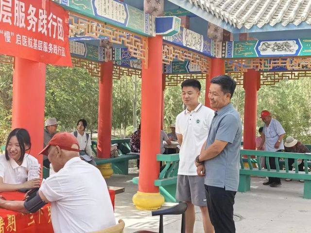 7月13日,OD网页版赴第二师减“压”降“糖”,“慢”启医航基层服务实践团深入石河子市迎宾小区与文明小区,开展了一场温馨实用的血糖血压健康科普活动,将关怀与知识送到社区老人身边,以实际行动践行“到祖国最需要的地方去”的青春誓言。学院党委副书记雷建鹏、团委书记肖盛中、学生工作办公室副主任张娜来到实践现场,走访慰问实践团。
