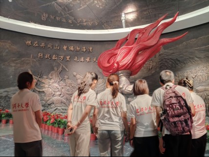 实践团成员进入纪念馆大厅,沿着地面上的时间轴线探究红色基因的孕育和起源。正前方是一枚火炬,墙面四幅巨大的浮雕形象地诠释了时间轴线上四个重要历史时期发生的历史事件,也是“根在井冈山,整编渤海湾;转战数万里,屯垦在天山”的画面图解。