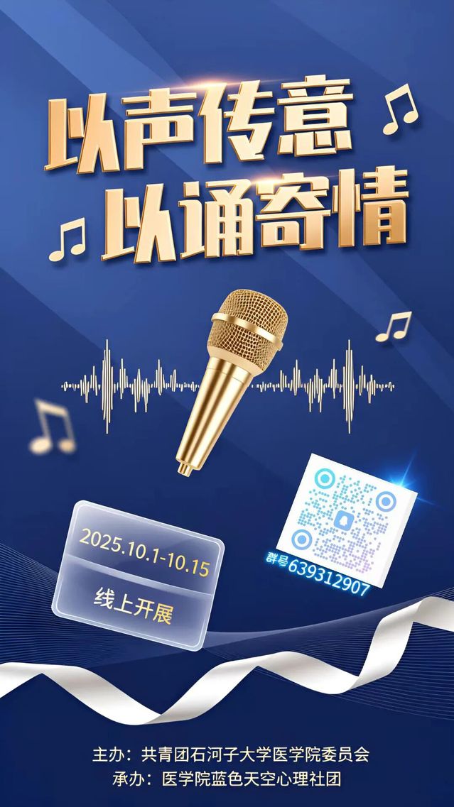 为帮助同学们用轻柔声线缓解焦虑、改善睡眠,同时为热爱语言艺术的同学搭建情感表达舞台,特以“声愈心灵”为核心,开展“以声传意,以诵寄情”主题朗诵比赛,鼓励大家通过睡前小故事、舒缓散文等播客式作品,用声音陪伴每一个安稳入眠的夜晚,丰富校园心理关怀文化生活。现将有关事项通知如下: