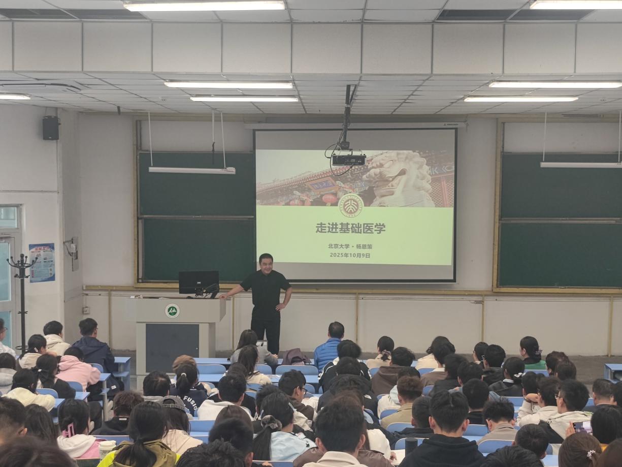 下午,杨恩策副院长在石河子大学南区杏1-二阶教室,为师生带来题为 “走进基础医学” 的专题讲座。讲座中,杨恩策副院长以生动案例解读基础医学的学科价值与专业发展前景,引导师生对基础医学专业的认知进一步深化,激发广大师生学习与科研转化的热情。基础医学系李冬妹老师听完讲座后表示:“杨恩策副院长的讲座深入浅出,既有大格局,又有人间烟火,不仅成功地搭建起基础理论与临床实践之间的桥梁,更从北京大学基础医学专业发展的实践激发了师生从事基础医学的决心与热情!”同学们也纷纷表示,作为大一的学生,听完讲座对未来的专业学习和职业规划有了更清晰的认识。