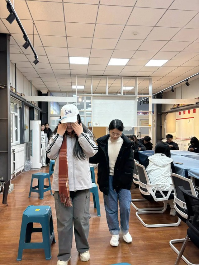 “以德育心·信任同行”站,一位同学通过轻拍肩膀的方式引导另一位蒙眼的同学跨越障碍,抵达终点。在引导者的悉心指引与蒙眼者的默契跟随中,责任与信赖悄然萌芽。掌心传递的温度,脚步的协调节奏,交织成无声的默契语言。原来,被信任是一种沉甸甸的托付,而信任则是勇敢前行的坚实力量。
