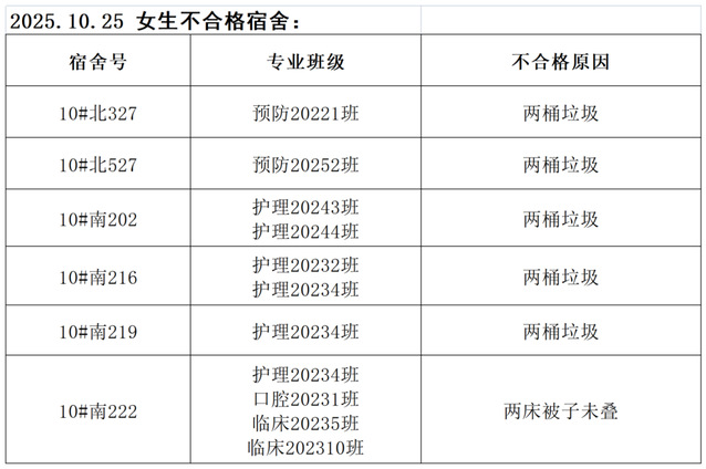 宿舍,这方承载青春记忆的温暖天地,不仅是我们朝夕相处的起居之所,更是见证同窗情谊、记录成长点滴的精神家园。一个文明有序、温馨和谐的宿舍环境,犹如润物无声的春雨,滋养着每位学子的心灵成长。为助力同学们打造理想的生活空间,医学院宿舍管理委员会秉承以生为本的服务理念,于本周对我院全体本科生宿舍展开了细致周到的卫生检查工作,通过专业指导和暖心建议,与同学们共同描绘室雅人和的美好画卷。本周检查发现,各宿舍卫生环境普遍较好,物品摆放整齐有序,窗台明亮干净,地面桌面整洁不杂乱。