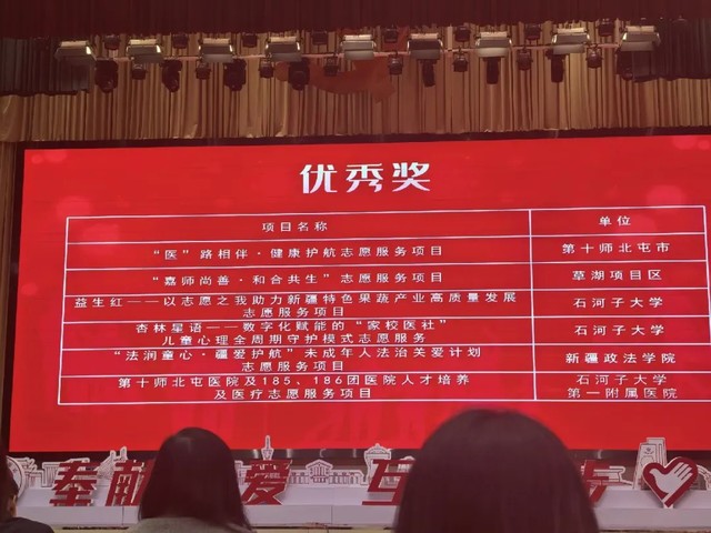 11月9日—12日,新疆生产建设兵团志愿服务项目大赛决赛在乌鲁木齐市圆满举行,共计60个项目在决赛中交流展示,学院“彩虹守护计划 —— 禁毒防艾,向阳而行” 项目斩获银奖,“杏林星语 —— 数字化赋能的‘家校医社’儿童心理全周期守护模式” 项目荣获优秀奖。